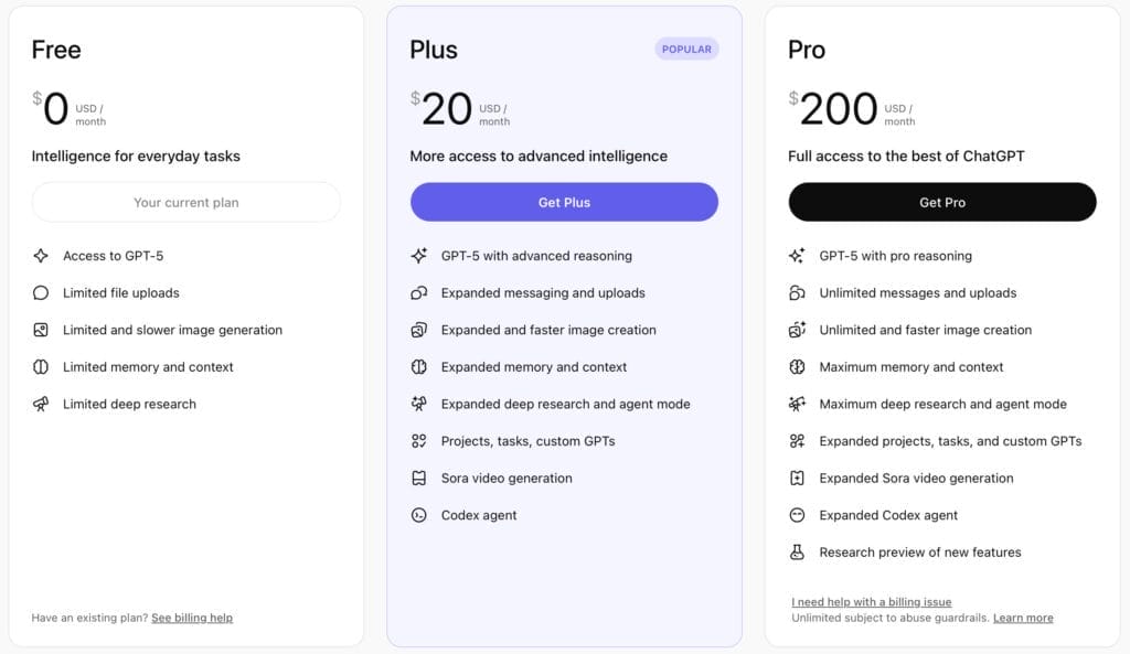 | AI Model or Feature | Free ($0/month) | Plus ($20/month) | Pro ($200/month) |