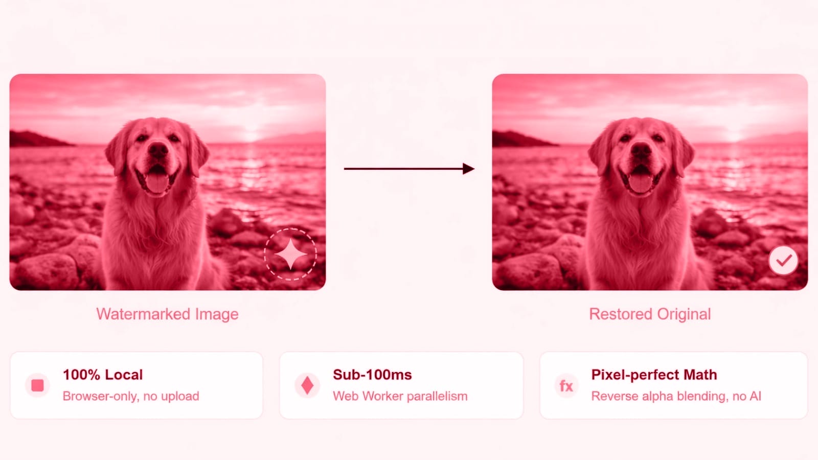 That consistency makes removal mathematically possible. A researcher named Allen Kuo documented and open-sourced the approach. Because the watermark is applied through a known formula, running the formula in reverse recovers the original pixel values to within one digit of their original state, a difference invisible to the human eye.